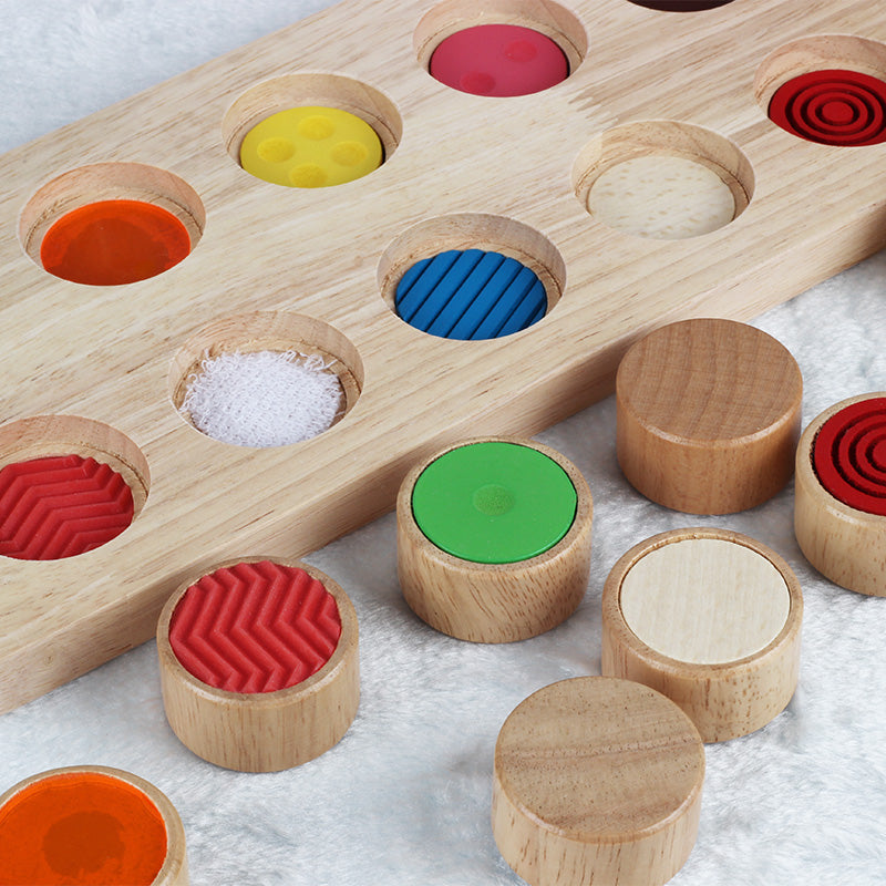 Reconoce las texturas de las piezas y asocia con las del tablero, estimulando el reconocimiento de la persona mediante el tacto
